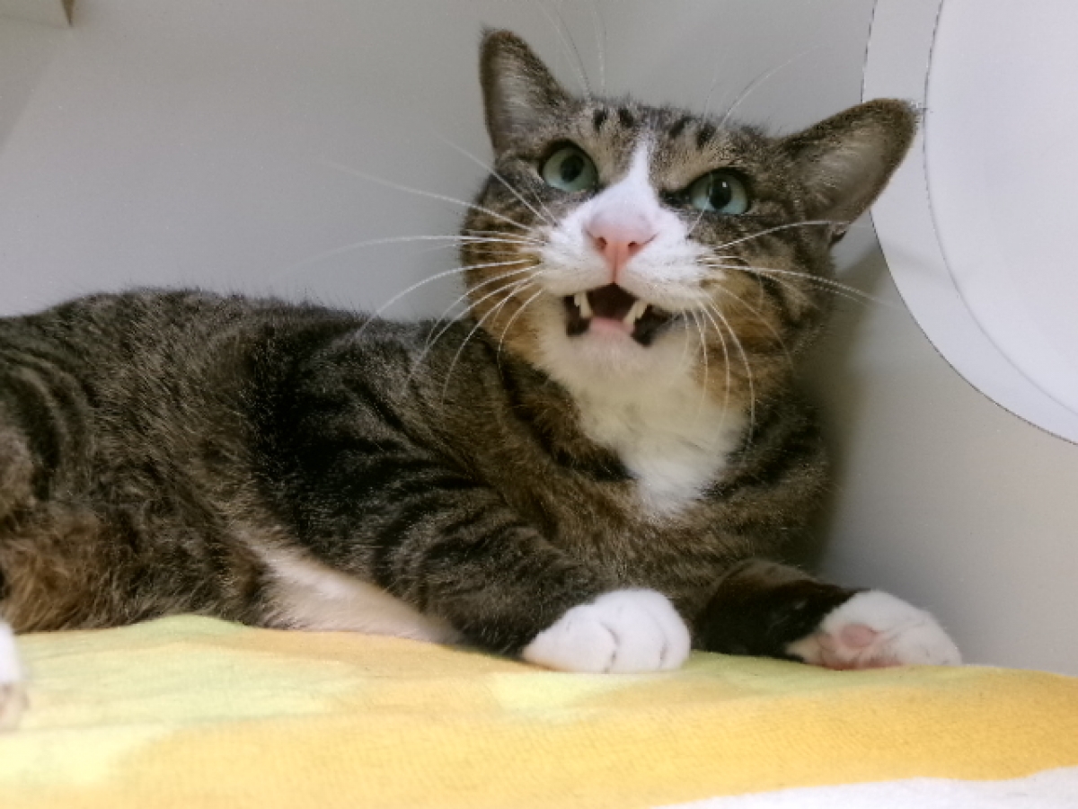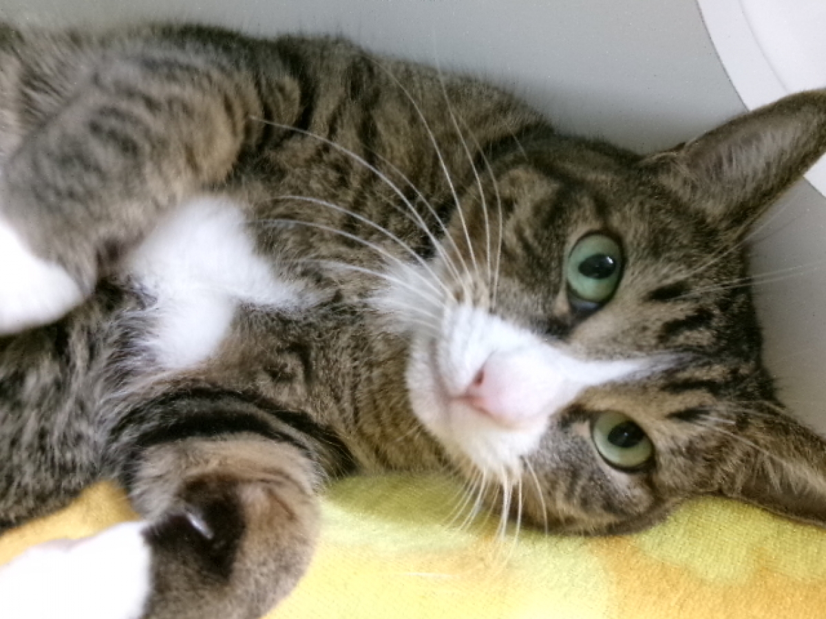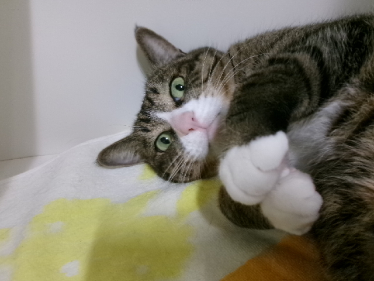 「しゃけこ」ちゃんは、顔を覗き込むと気弱な声で一言鳴き、そっとこちらの様子をうかがうような、控えめな性格の女の子です。抱っこは得意ではありませんが、撫でられることは大好きで、頭をぐいぐいと押しつけてきたり、ゴロンとお腹を見せたりと、たっぷり甘えてくれます。「しゃけこ」ちゃんに優しく寄り添ってくださるご家族を募集しています。