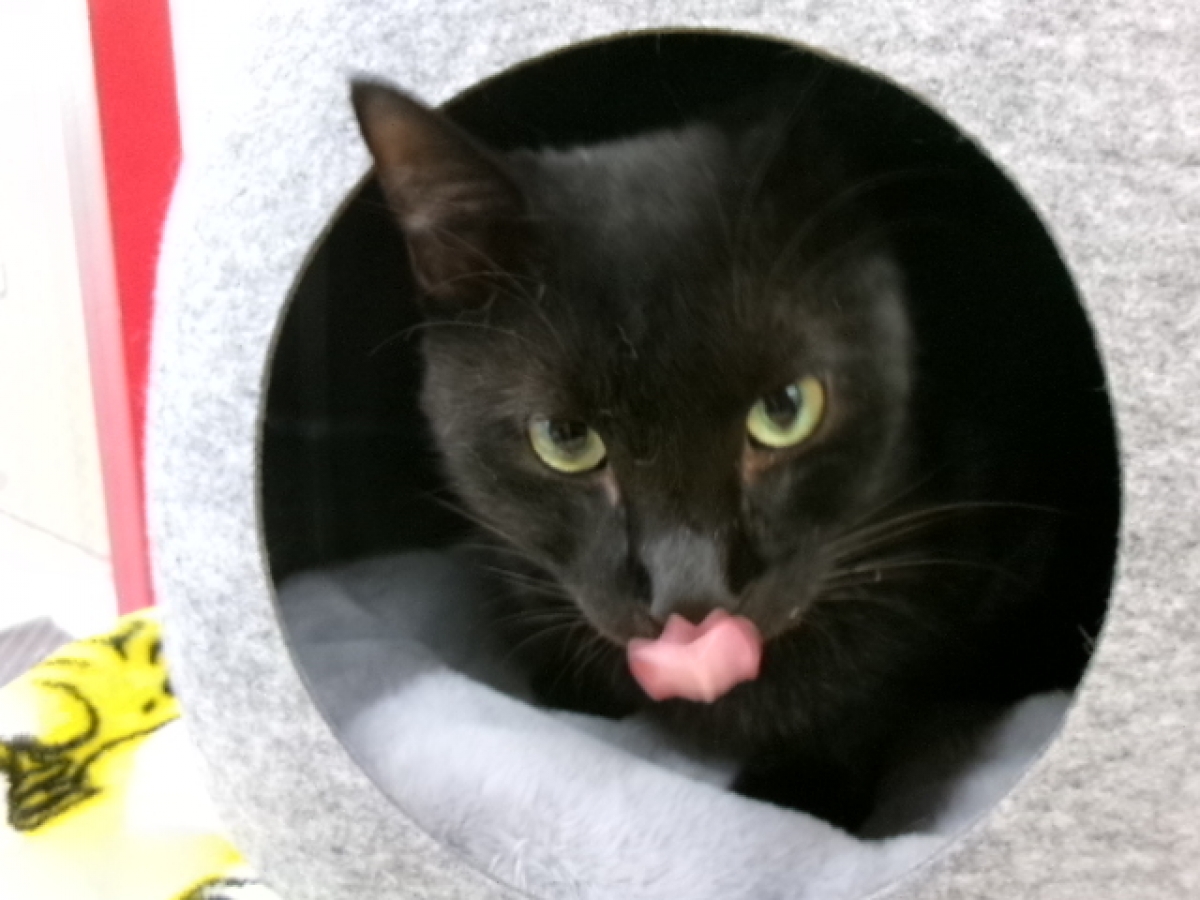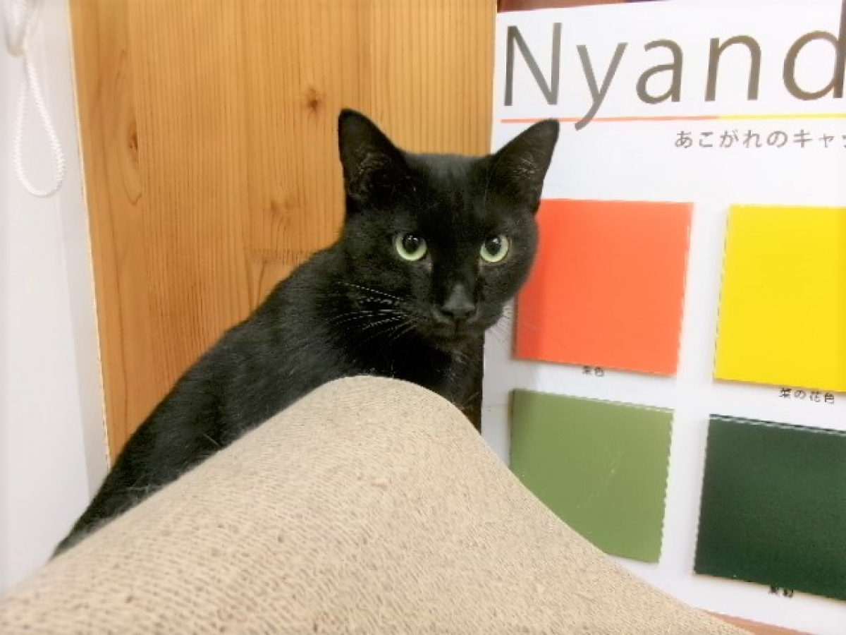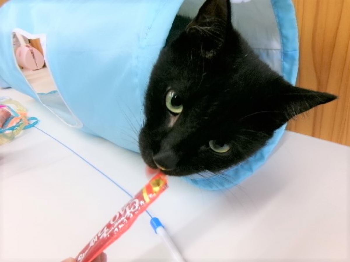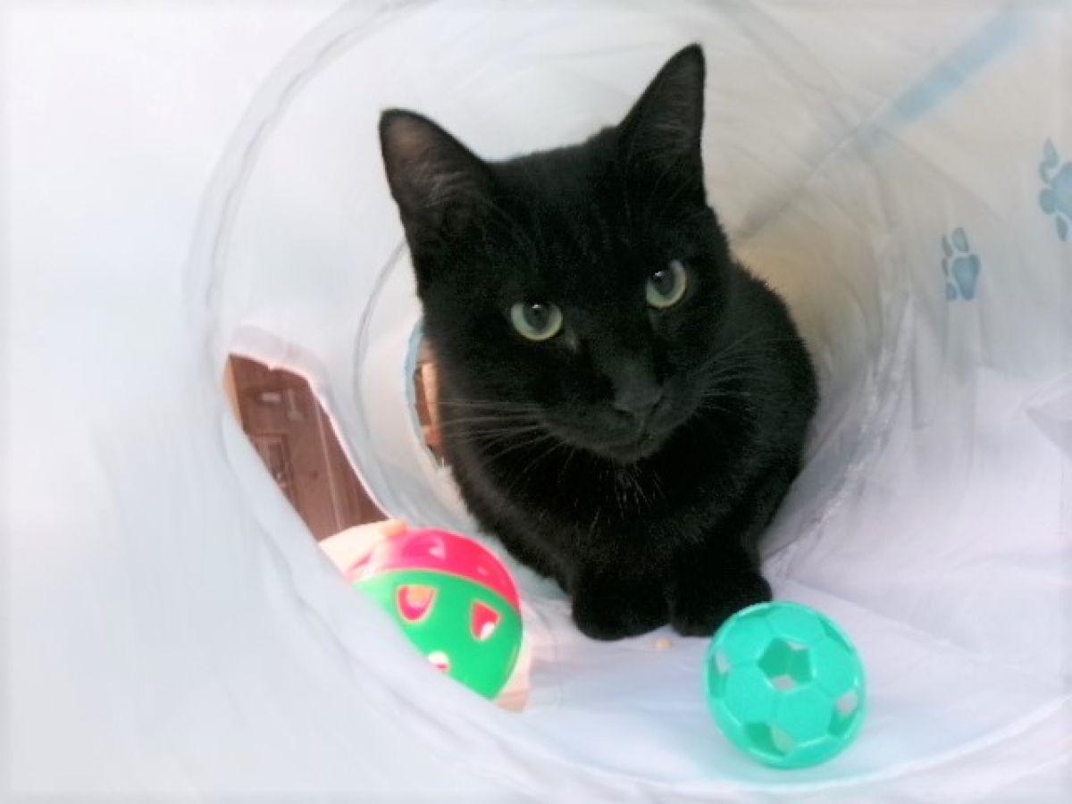 「霧島」くんは、全身真っ黒のたくましい体つきをした男の子です。初めての場所には緊張してしまうものの、慣れてくるとやんちゃで人懐こい性格を見せてくれます。活発なので、通りかかったスタッフに「遊ぼう」とばかりに少し強めの猫パンチでじゃれてくることもしばしばあります。