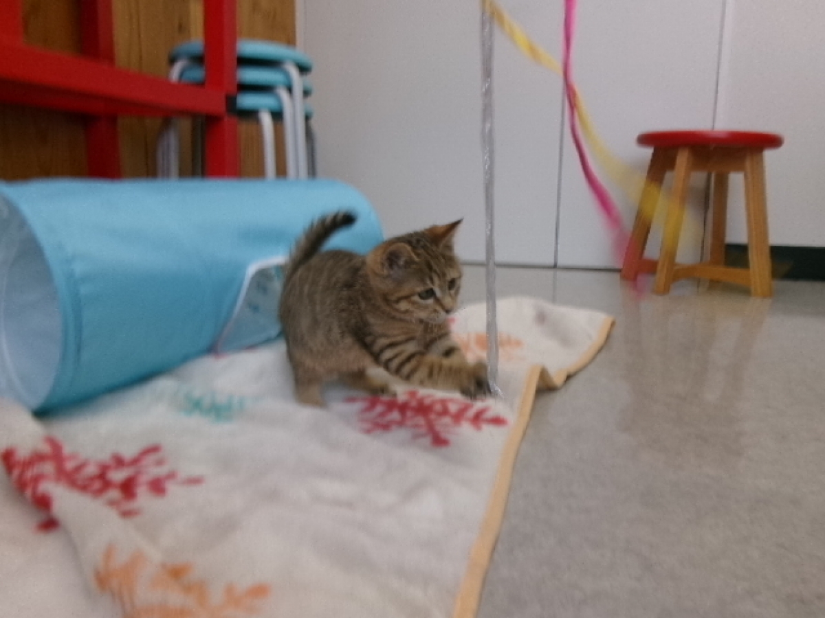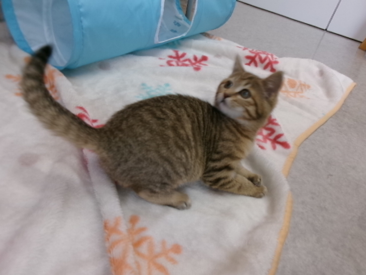 「からし」ちゃんは、黄色味かかったキジトラの女の子です。子猫らしいエネルギッシュな性格で、考えるよりも早く体が動きます。たくさんのことに果敢に挑むため、よくスタッフをどきどきさせるお転婆さんです。「からし」ちゃんをあたたかく迎えてくださるご家族を募集しています。